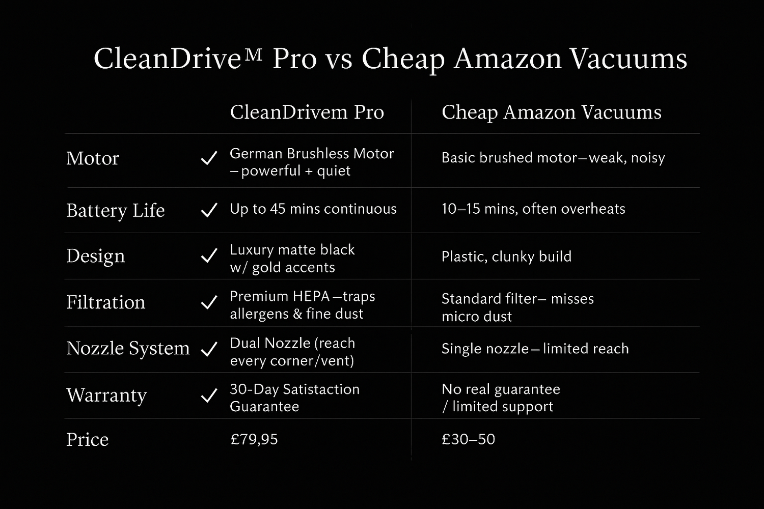 "Really happy with my CleanDrive™ Pro Vacuum. The suction power is excellent and it feels premium in use. My only small hiccup was with delivery taking a little longer than expected, but once it arrived I couldn’t fault the product at all. Works exactly as promised and I’d definitely recommend it"
